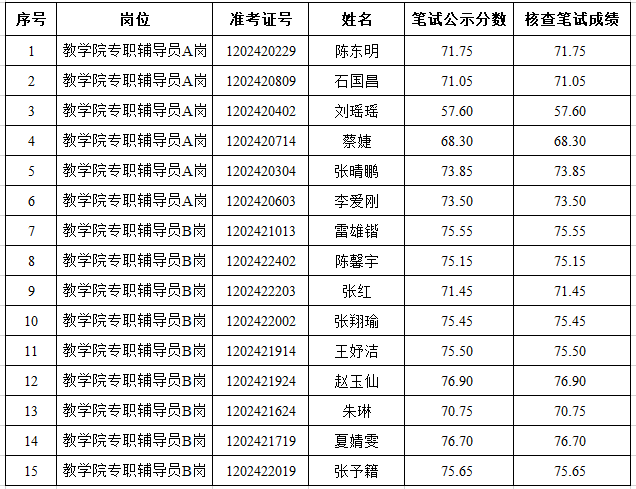 根据《乐山师范学院2024年1月公开招聘工作人员公告》规定,我校于2024年3月6日对笔试成绩进行了公布,3月6日至7日17:00,受理了笔试考生查分申请。截止3月7日17:00前,共有15名考生提出查分申请。3月8日,我校按照相关复查流程对15名考生的笔试成绩进行了复查,现将复查结果公告如下: