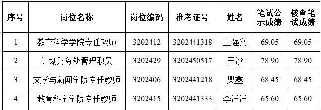 根据《乐山师范学院2024年2月公开招聘工作人员(编制外聘用)公告》规定,我校于2024年3月21日对笔试成绩进行了公布,3月21日至25日17:00,受理了笔试考生查分申请。截止3月25日17:00前,共有4名考生提出查分申请。3月26日,我校按照相关复查流程对4名考生的笔试成绩进行了复查,现将复查结果公告如下:
