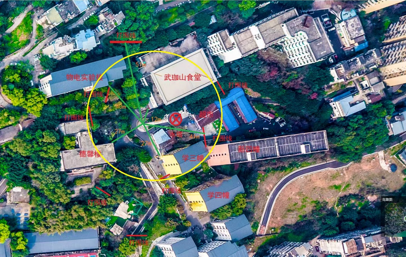 一、封闭德馨楼-象鼻嘴交会口,德馨楼侧门封闭,封闭德馨楼背侧。武珈山校内住户及师生请绕行武珈山天桥或垃圾库侧道路。