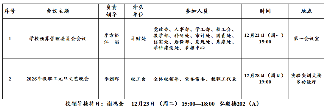 第16周(12月22日—12月28日)主要会议和活动安排