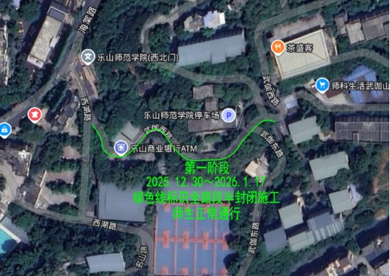 1.第一阶段2025年12月30日24时00分至2026年1月17日18时00分,跨喜中心至武珈山食堂全路段半封闭施工,边坡顶车行道外边缘将设置围挡,行人、车辆均能通行,但通行过程中请注意安全。