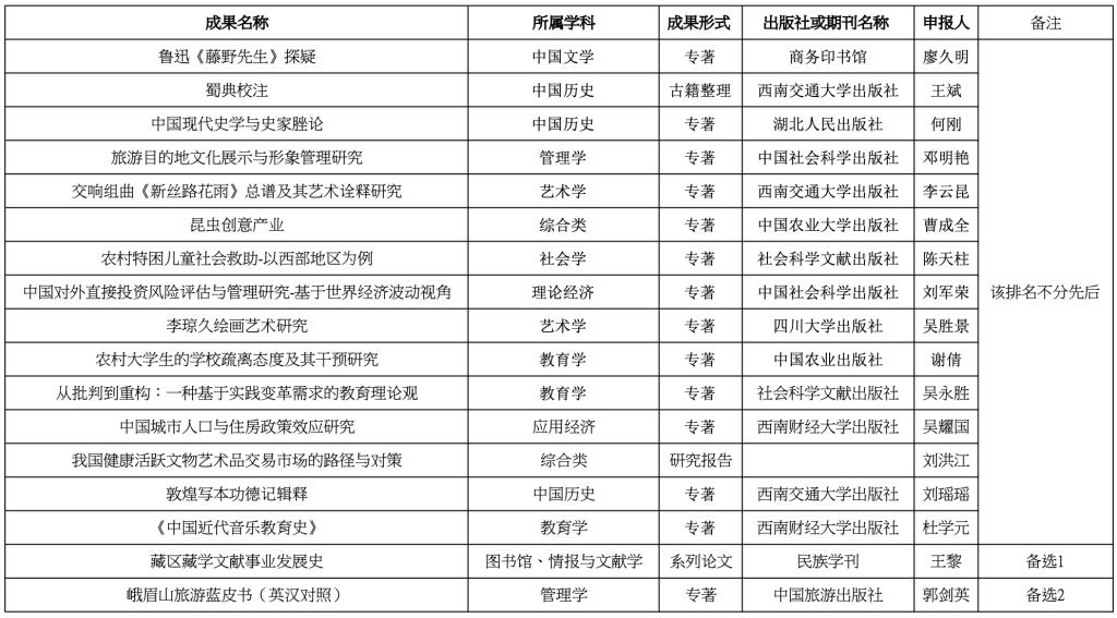 根据四川省哲学社会科学评奖办公室《关于做好四川省第十九次社会科学优秀成果评奖初评推荐工作的通知》的要求,12月9日上午学校社科联组织专家对上报成果进行初评,最终确定17项成果推荐至省社科联(包括两项备选),现将初评推荐的17项成果名称、成果形式情况予以公示: