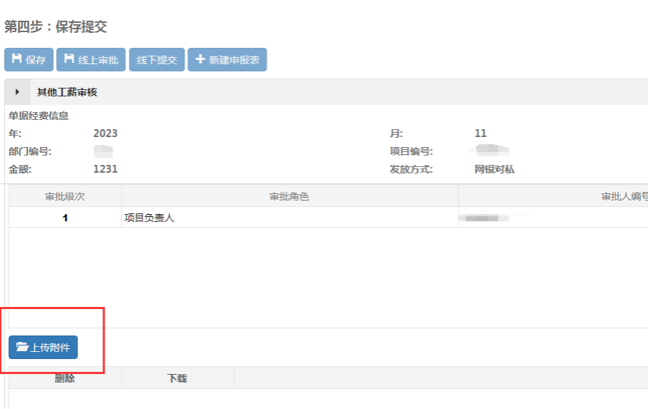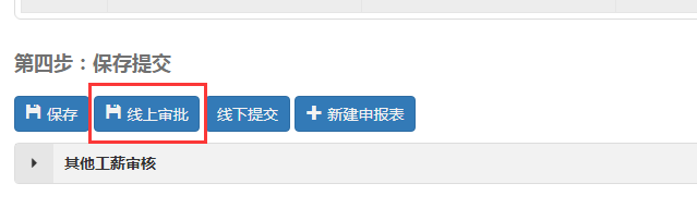 第二步:选择“网上申报系统”进行单据填报(注意:在填报校外人员发放和学生发放单据时,需清楚的填写“个人摘要、单价、数量”,不再另外提交工作量清单,但校外专家备案表仍需提交),选择“线上审批”提交单据;