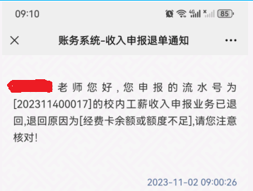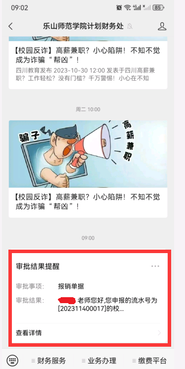 (一)计划财务处将通过 “乐山师范学院计划财务处”微信公众号推送审核消息给申报人,如图: