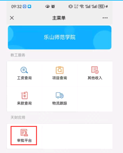 第一步:进入“乐山师范学院计划财务处”微信公众号,进入“业务办理” 的“财务平台”;