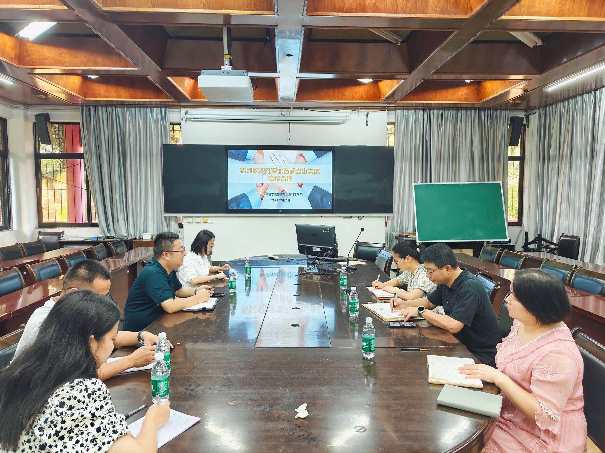 本网讯(文/王强、图/王强)9月5日,在旅游与地理科学学院102会议室,学院党委副书记、院长郭剑英,副院长孙永兴,分团委书记、学生工作办公室主任江纳与红军渡西武当山景区主任、音乐学院2003级优秀校友张波一行就访企招岗、校地合作事宜展开深入洽谈。