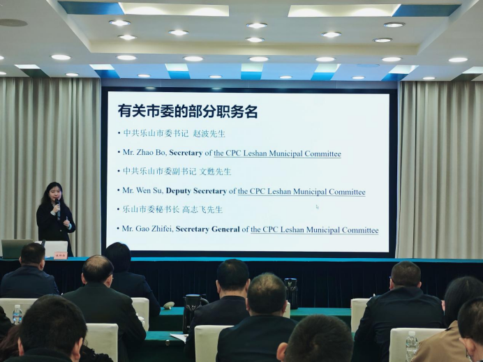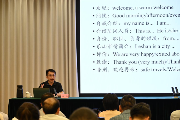 本网讯(文/图 陈析西)近日,为落实中共乐山市委关于建设享誉全球的国际旅游目的地的决策,按照公务应用场景外语能力的要求,由乐山市委办公室举办的“乐办讲堂——英语夜校”正式开课。本次课程以公务接待、外事礼仪、文旅推介、日常交流等为核心开展外语能力专题培训,旨在多维度提升公务人员外语应用能力。我校外国语学院副院长王林、应用英语系主任陈析西应邀授课。