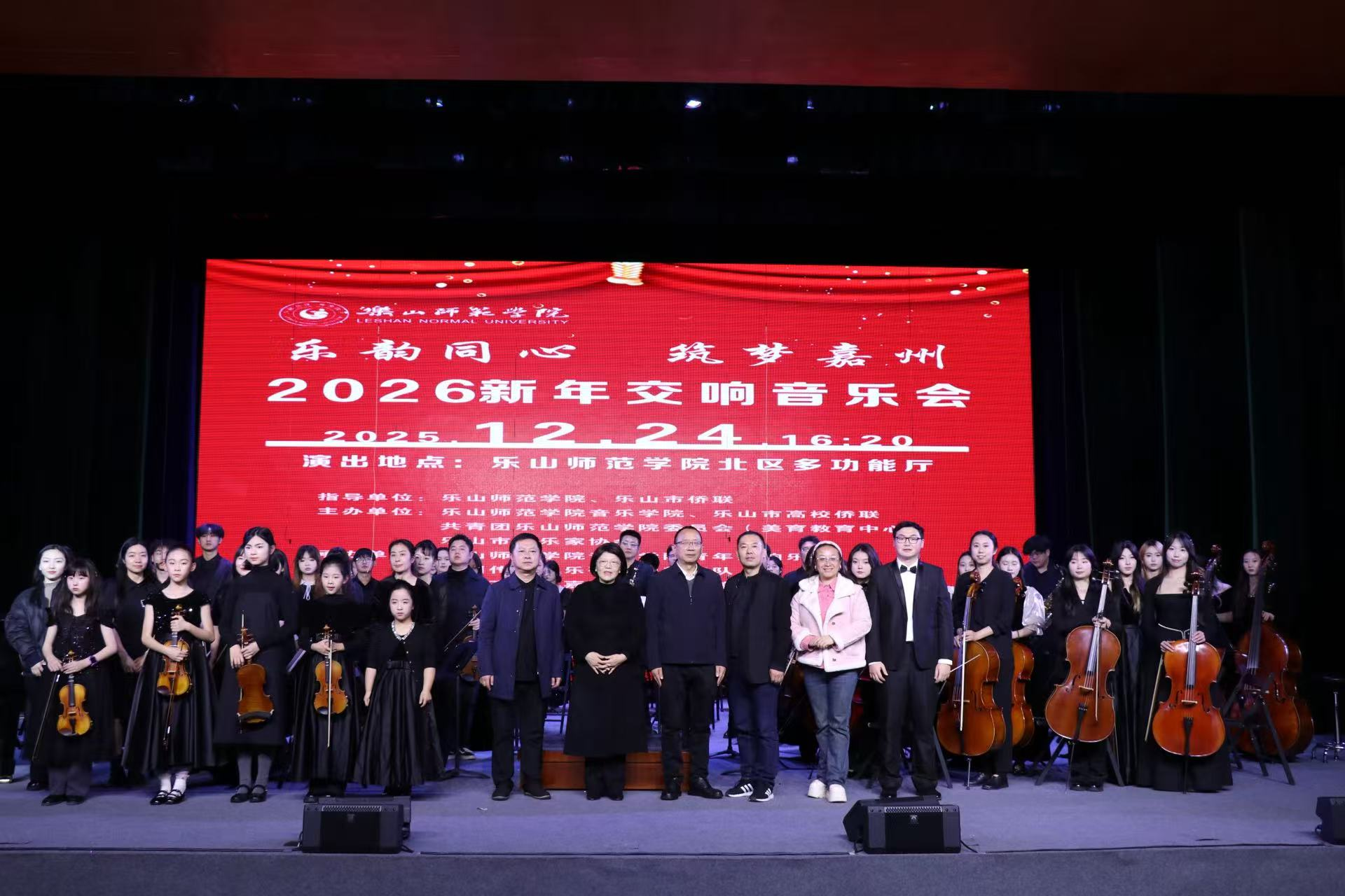 本网讯(文 范文婧/图 韩笑)12月24日,“乐韵同心·筑梦嘉州”2026新年交响音乐会在我校实训大楼多功能厅隆重举行。音乐会由音乐学院、乐山市侨联、校团委等单位共同主办,以交响乐为纽带,传递对侨胞的关怀与新春祝福,彰显校地同心、共筑美好的深厚情谊。音乐学院党委书记宋军、乐山市侨联主席黄学文等嘉宾出席活动,与师生、侨胞代表共赏音乐盛宴。