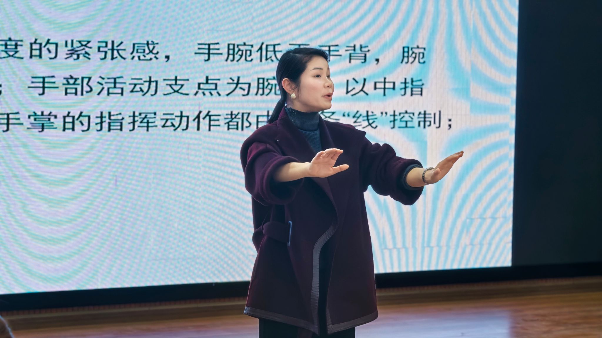 杨嵋从合唱理论与指挥法两方面开展培训。在理论环节,她从合唱的声部构成、团队协作等方面,层层剖析,细致入微地为教师们构建起完整的合唱知识体系。实践环节中,杨嵋聚焦指挥法,从基本拍入手,通过示范,详细讲解力度、速度和表情的变化。为了让教师们更好地掌握,她还结合《草原上升起不落的太阳》《四季的问候》等合唱曲目,组织大家进行曲目指挥训练。培训现场,老师们学习热情高涨,积极投入,纷纷上台实践。