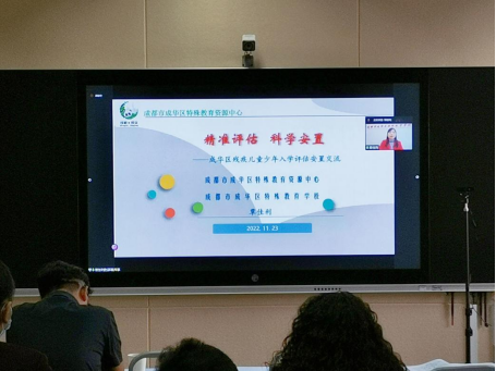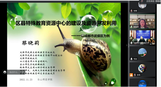 11月23号下午,学员们以线上腾讯会议的形式与成都市武侯区特殊教育资源中心、成都市行知实验小学进行了交流。武侯区特殊教育资源中心副主任蔡晓莉、以及行知实验小学教师徐泽良、卿华分别就《区县特殊教育资源中心建设》《行知实验小学融合教育管理体系》《资源教室工作》进行了交流与分享。