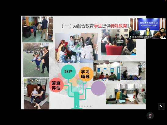 武侯区特殊教育资源中心教师廖兴君、王静分别就“区资源中心与融合学校协同工作”、“武侯区培智学校课程建设的实践情况”进行了主题分享。成都行知实验小学的张华丽老师进行了《月光曲》随班就读教学活动展示。