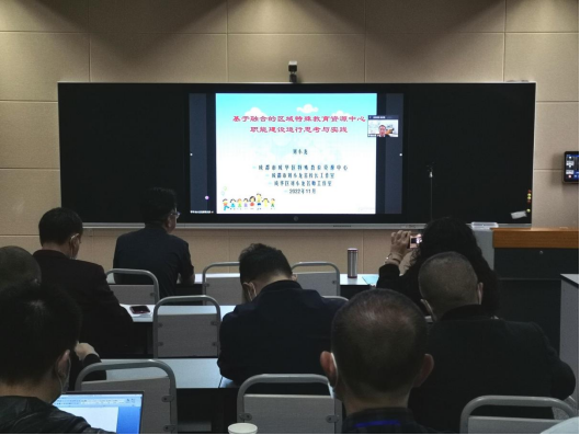 11月23号上午,受疫情影响,学员们在弘毅楼504A、504B参与了“聚焦融合教育,推进区域特教高质量发展”为主题的线上研培活动。活动中,成都市成华特校校长刘小龙就《基于融合的区域特殊教育资源中心职能建设运行思考与实践》主题从特殊教育资源中心的认识、建设与运行、特殊教育学校改革探索、区域融合教育的发展五个方面进行专题分享。