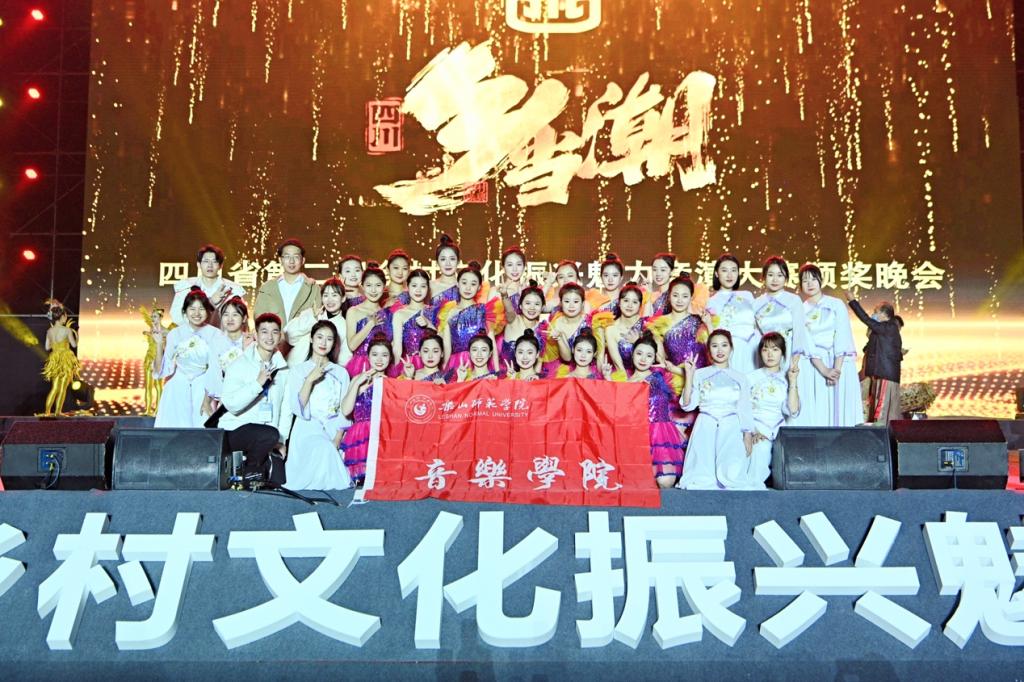 本网讯(文、图/韩志成)2022年11月24日,音乐学院受乐山市委宣传部邀请,参加四川省第二届乡村文化振兴魅力竞演大赛颁奖晚会的演出,本次竞演以“四川‘乡’当潮”为主题,以乡村为背景,以群众为主角,通过线上线下两个渠道同步开展竞演,激发大众对乡土文化的热爱和继承发扬的热情。晚会共四个篇章,分别为《阳夏》《清秋》《玄冬》《芳春》,我校27名师生深度参演此次颁奖晚会中重要的三个篇章。17、18日晚会导演钟屹来到我院指导排练舞蹈和器乐节目,我院师生展示出较好的专业风采。