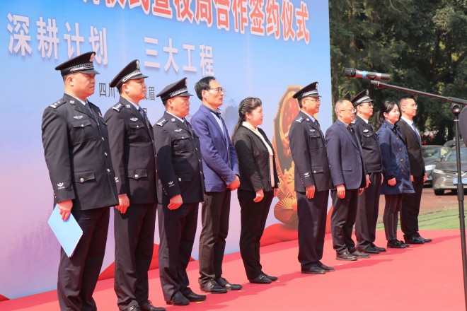 本网讯(文、图/蔡燕)为进一步加强与地方当局的联系,促进校地双方之间的资源共享、互促共赢。3月30日上午文新学院和峨眉山公安局校局合作签约仪式于峨眉山刑警大队顺利举行,文新学院党委书记彭杨、院长刘传启参与了此次签约仪式,参加此次大会的还有法管学院党委书记程勇、副书记翟雅媛及峨眉山公安局相关领导。