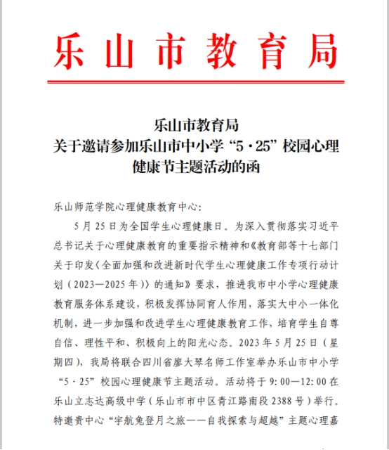 本网讯(文/李勇 图/刘思勇)5月25日-26日,乐山市中小学“5·25”校园健康节主题活动在乐山市立志达高中举行,为深入落实《教育部等十七部门关于印发<全面加强和改进新时代学生心理健康工作专项行动计划(2023-2025年)的通知》文件精神,为服务乐山市中小学心理健康教育服务体系建设提供专业帮助,探索大中小心理健康教育一体化建设的机制运作的方式,受乐山市教育局的诚挚邀请,我校心理健康教育中心于5月25日为乐山市立志达高级中学的学生开展“宇宙兔登月之约——自我探索与超越”主题的心理嘉年华活动,乐山市宣传部、教育局等部门、乐山市直属(管)中小学及42所中小学分管副校长、专职心理健康教育教师、四川省廖大琴名师工作室成员总计100余名教师现场观摩。