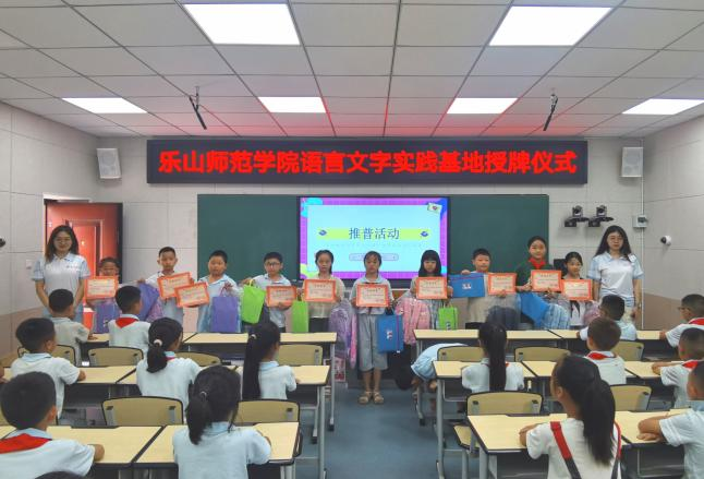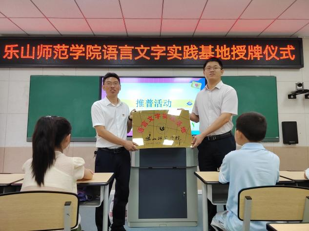 本网讯(文/陈怡洁、图/陈怡洁 李奕伶)为进一步深化校地合作,助力乡村振兴,推进普通话全面普及。2023年7月2日上午,“乐山师范学院语言文字实践基地”授牌仪式在乐山市峨边彝族自治县县街小学顺利举行。峨边彝族自治县县街小学童仕林校长、乐山师范学院教师教育学院胡涛老师、文学与新闻学院钟蕾、田青老师及三名推普志愿者同县街小学五十余名同学参加仪式。乐山师范学院教师教育学院胡涛老师为语言文字实践基地代表授牌,随后由峨边彝族自治县县街小学校长童仕林接受牌匾。童仕林校长向同学们展示牌匾内容,告诉同学们学习普通话的重要性,激励同学们认真、踏实地学习普通话。