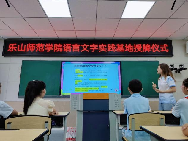 授牌仪式完毕,来自乐山师范学院的三位志愿者老师周雪、陈怡洁、李奕伶为在场的同学带来了一堂生动有趣的普通话学习课。