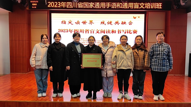 本网讯(文/李莉图/谭君杰、魏艺文、邵识伊、李莉、周梦婷)为加强国家通用盲文校内推广使用和社会化推广服务工作,四川省教育厅和四川省残疾人联合会于2023年12月8日举办了2023年四川省盲文阅读和书写比赛暨指尖“读”世界通用盲文比赛。特殊教育学院、康复学院副院长张杨、听障教学部专业负责人刘秋竹,以及专任教师袁梅玲带领我校特殊教育专业五名本科生参加了本次比赛。