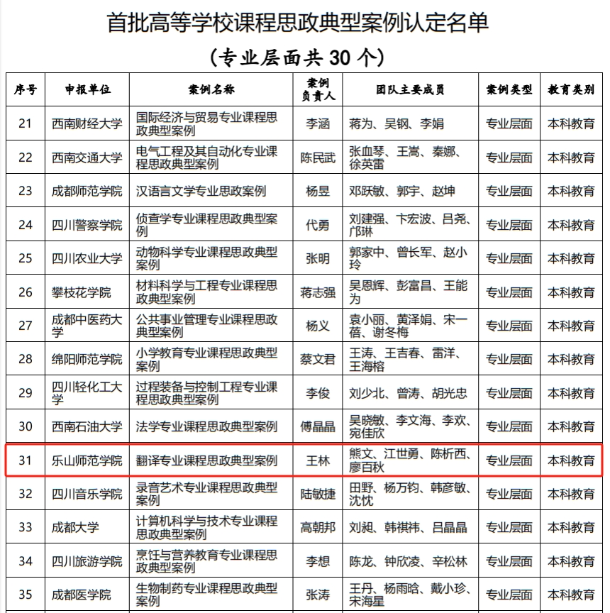 本网讯(文/图:王林)近日,四川省教育厅公布四川省首批高等学校课程思政典型案例。我校外国语学院“翻译专业课程思政典型案例”入选。这是继2022年翻译专业获批四川省课程思政示范专业后,外国语学院在专业建设上的又一次突破。