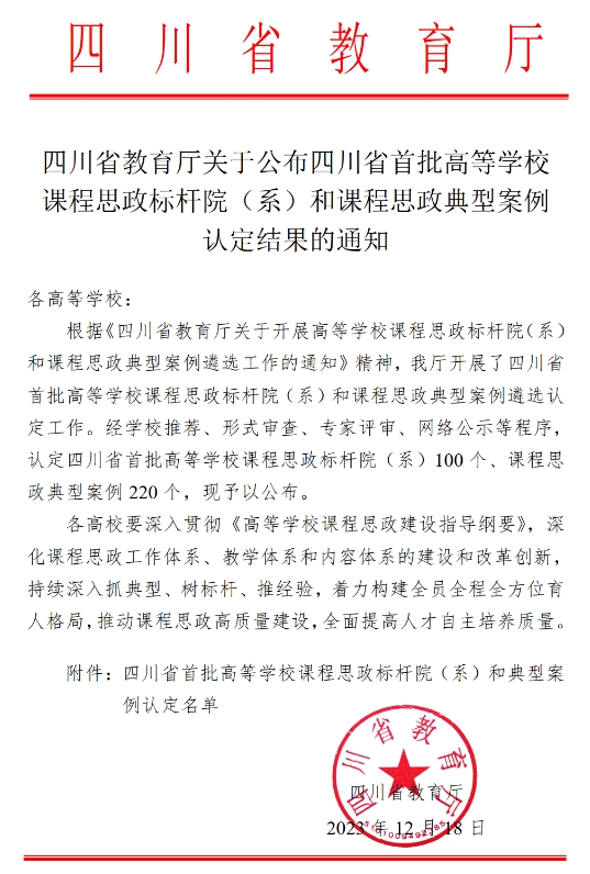 本次四川省教育厅 “高等学校课程思政典型案例”遴选深入贯彻党的二十大精神,落实立德树人根本任务,突出价值引领和示范推广,对加快构建全面覆盖、类型丰富、层次递进、相互支撑的课程思政体系有积极作用。外国语学院“翻译专业课程思政典型案例”是全省唯一外语类专业层面课程思政典型案例。