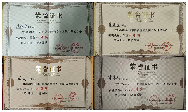 本网讯(文/廖可悦 图/王雪猛等)3月19日,在乐山市科学技术局、乐山市科学技术协会举办的2024年乐山市科普讲解大赛中,由我校科研处、党委学生工作部选派的四名学生2人获一等奖、1人获二等奖、1人获三等奖,创我校历史最好成绩。