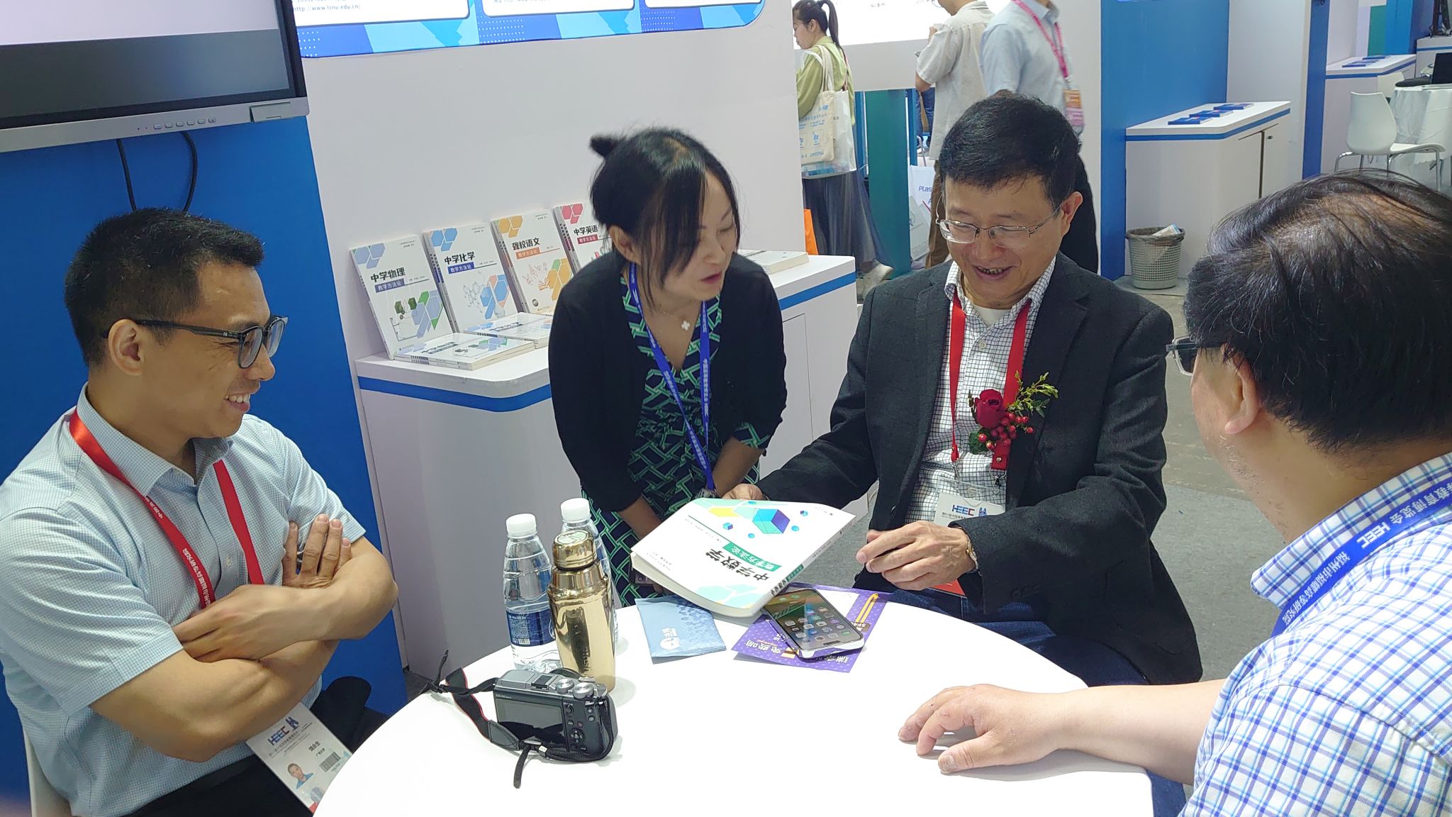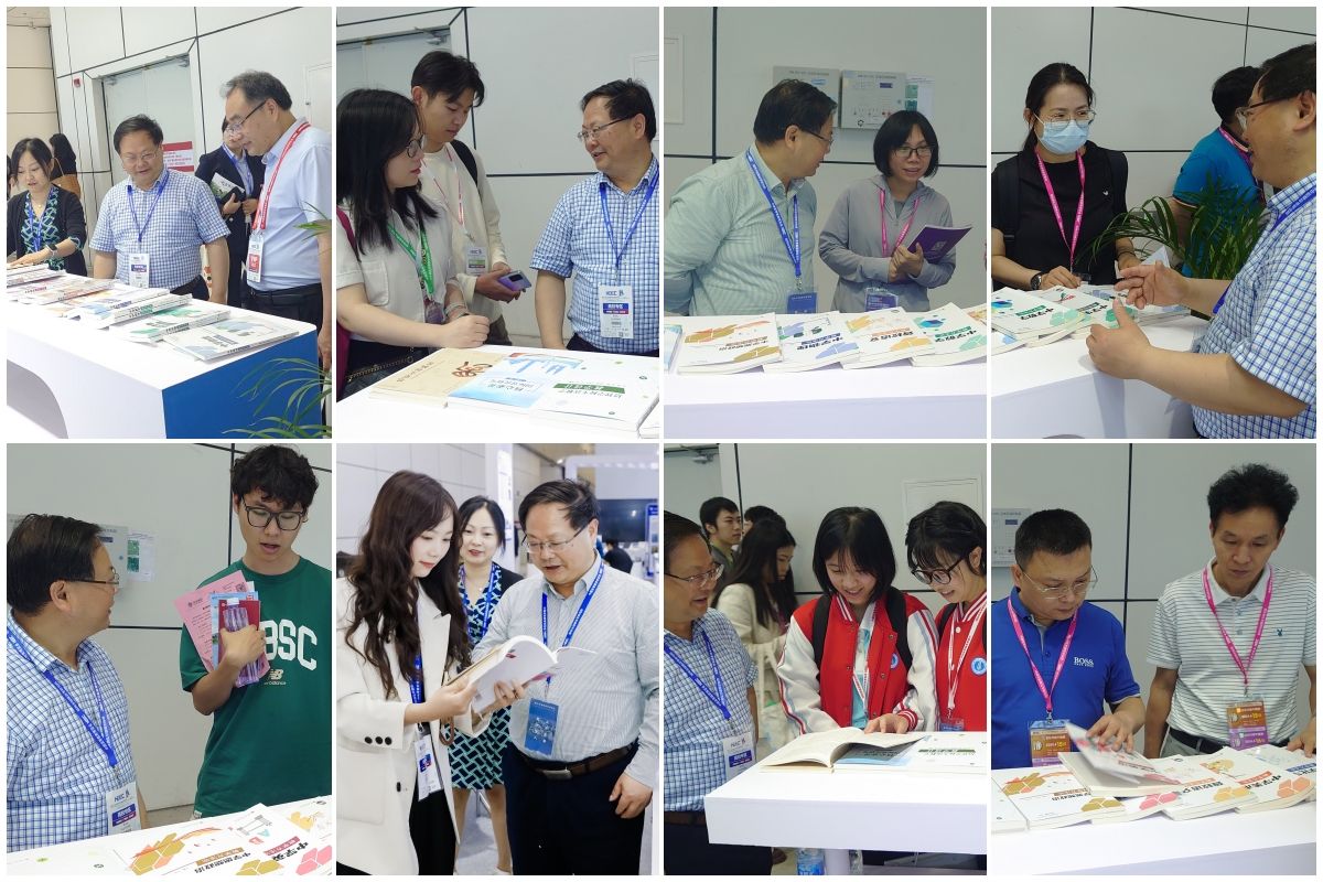 主委会大屏幕滚动播放了我校《前行》宣传片。展位展板展示了我校学科教学论教师的教学学术成果。展会现场,我校的成果引起了众多高等院校、基础教育工作者以及中学生的浓厚兴趣,大家纷纷前来咨询。众多参会者表达了合作的意愿。参会的三位教师通过图书讲解、签名赠书等形式对成果进行了详细介绍和全面推广。