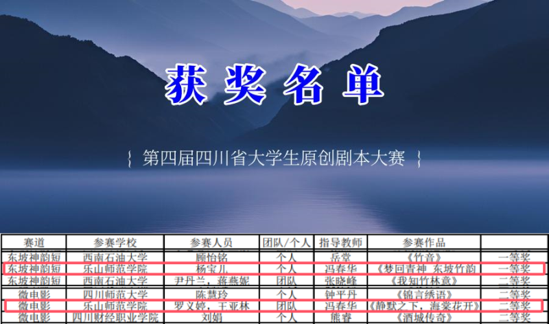 本网讯(文 图/冯春华) 近日,第四届四川省大学生原创剧本大赛获奖名单公布,致公党党员、我校特殊教育学院冯春华老师指导的学生在激烈的竞争中脱颖而出,取得较好成绩。其中,学生杨宝儿个人以其独特的视角创作的作品《梦回青神 东坡竹韵》获“东坡神韵短剧”赛道一等奖;罗义婷、王亚林团队的作品《静默之下 海棠花开》获“微电影”赛道二等奖。