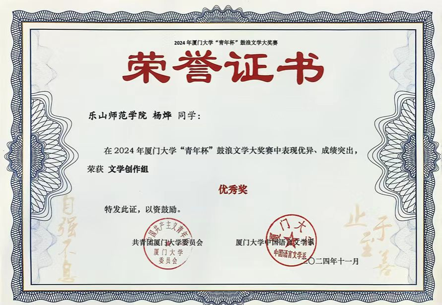 (图/文 杨烨)在近期圆满收官的“青年杯”鼓浪文学大赛中,我院21级汉语言文学专业学生杨烨荣获文学创作组优秀奖。2024年“青年杯”鼓浪文学大赛由厦门大学主办,是厦门大学中国语言文学系、鼓浪文学社联合福建省作家协会、厦门市作家协会等单位,北京大学、中国人民大学、北京师范大学、南京大学、武汉大学、中山大学等全国高校参与的文学赛事。