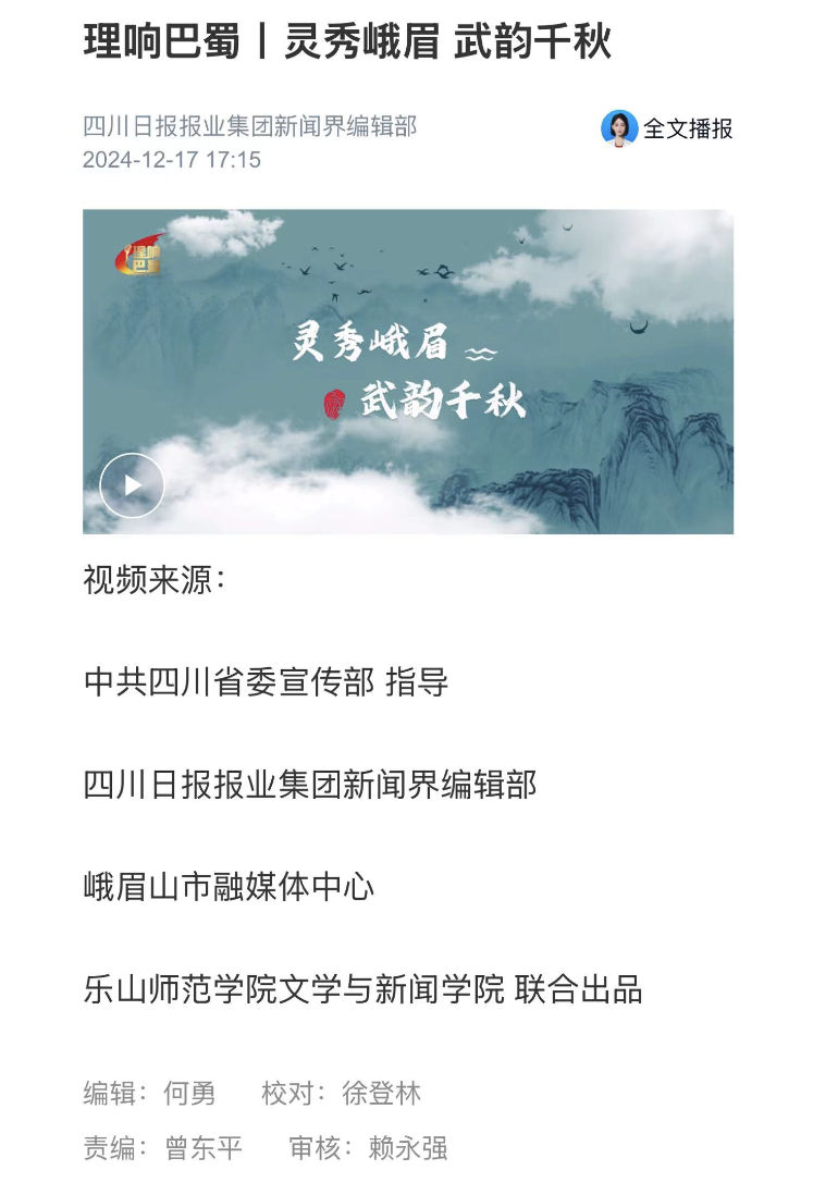 本网讯(王辉/文、杨晓军/审核)12月17日,由中共四川省委宣传部指导,四川日报报业集团新闻界编辑部、峨眉山市融媒体中心与我校文学与新闻学院联合出品的短视频《灵秀峨眉 武韵千秋》,被知名理论传播平台“理响巴蜀”采用并发布。
