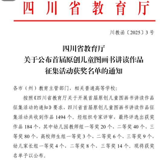 本网讯(文/贾琪 、图/陈秋役)2025年1月6日,由四川省教育厅主办的首届原创儿童图画书讲读征集活动发来获奖通知,教育科学学院学前教育专业学生陈秋役在该活动中脱颖而出,斩获佳绩,荣获高校师生组赛道二等奖。