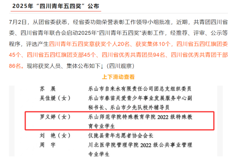 本网讯(文、图/罗义婷)近日,经省委功勋荣誉表彰工作领导小组批准,共青团四川省委、四川省青年联合会启动2025年“四川青年五四奖”表彰工作,经推荐、评审、公示等程序,我校特殊教育学院2022级学生罗义婷荣获“四川省优秀共青团员”称号。她以实际行动践行“党有号召,团有行动”的信念,展现了新时代团员青年的使命担当。