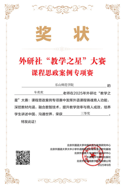 本网讯(文、图/车欢欢)2025年外研社“教学之星”大赛课程思政案例专项赛结果揭晓,我校外国语学院杨丹老师获得“主赛道”二等奖;王林副教授、车欢欢副教授获得“理解当代中国”赛道三等奖。