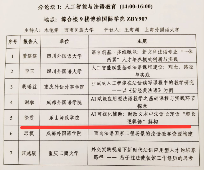 会议以“人工智能赋能法语教育:机遇、挑战与未来路径”为主题,深刻探讨了数智时代背景下法语专业建设与人才培养的创新路径,包括新时代法语应用型人才培养路径、人工智能时代下的法语课程设计与教学模式创新实践、法语专业课程思政建设的创新模式与实践路径等议题。徐雯在分论坛1“人工智能与法语教育”做题为“AI可视化辅助:时政文本中法语长定语超长逻辑链解构”的小组发言,以“理解当代中国”时政文本汉法翻译课程为案例,聚焦长定语转换的教学难点,分享教学创新。徐雯为破解传统教学“单向灌输”的困境,引入生成式AI作可视化工具,通过生成对比语料、提供“一句多译”、开展智能巩固三大功能,构建“观察-归纳-分析-实践”新模式,将抽象策略转化为实例,激发学生主动性,推动教学从“知识灌输”转向“能力培养”,为法语翻译教学创新提供新的路径。