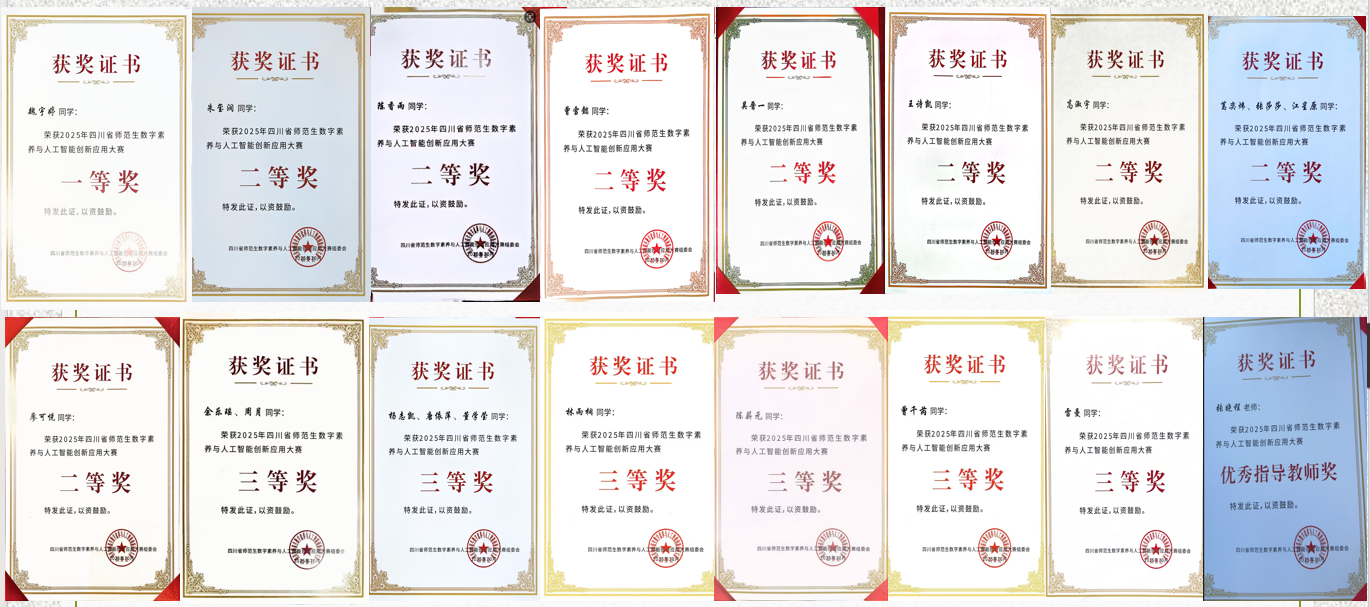 大赛聚焦智能时代教师教育发展需求,以提升师范生数字素养为核心,旨在探索师范教育改革新路径,增进多元主体协同交流合作,共同构建师范生数字素养提升与人工智能创新应用的良好生态。大赛共吸引全省20余所学校积极参与,征集参赛作品400余项。经网络评审,共计60余项优秀作品成功晋级决赛。我校文学与历史文化学院魏宇婷同学以第一名的优异成绩荣获一等奖,张晓程老师获优秀指导教师奖。我校与西华师范大学、成都理工大学、成都师范学院等7所高校荣获“优秀组织奖”。