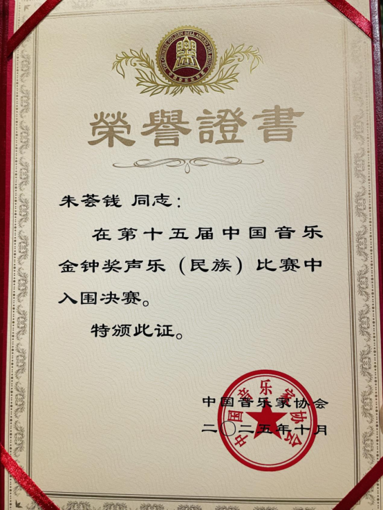 朱荟钱在四川省选拔赛中以一曲《飞针挑花》,融合四川民歌韵味与现代花腔技巧的演绎赢得了评委的肯定,最终以民族组一等奖的成绩晋级仅有85名入围的国赛,并在全国比赛中一路披荆斩棘,成为四川唯一晋级全国半决赛和决赛的民族组选手。在全国决赛阶段,朱荟钱面对来自中央音乐学院、中国音乐学院等顶尖专业院校的强劲对手,她精心挑选了《莲的心事》和《新疆之花》两首风格迥异的作品,在交响乐团的伴奏中流露出真挚的情感,将作品表达得淋漓尽致。最终以95.96分的成绩获第九名,成为全国决赛中唯一来自地方师范院校的获奖选手。