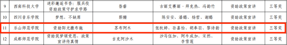 由特殊教育学院、康复学院兰芳、李晓畅老师指导,苏布阿木、张秋婷、孙嘉怡、胡奉羽、黎诗韵主创的资助政策宣讲作品《资助阳光撒布拖》获三等奖。该作品讲述了凉山少年苏布阿木曾因家庭贫困,在国家助学政策的帮助下,他顺利进入乐山师范学院特殊教育学院学习。从受助者到宣讲者,他回到家乡布拖县,用亲身经历向乡亲们传递政策温暖,诠释“知识改变命运”的信念。他的故事展现了国家资助政策如何点亮贫困学子的希望,让梦想在爱与接力中延续。