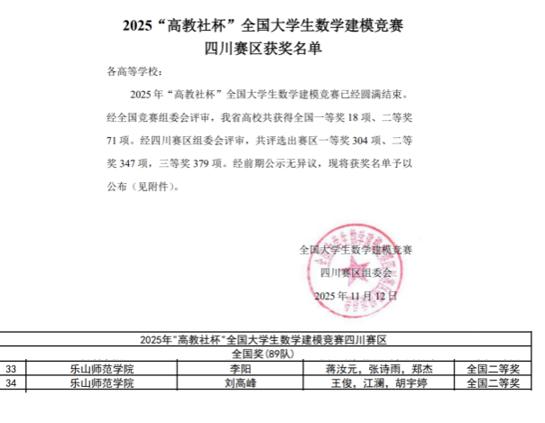 由数统学院李阳老师指导的蒋汝元(2023级数学与应用数学专业)、张诗雨(2023级数学与应用数学专业)、郑杰(2023级金融数学)组成的团队荣获全国二等奖;数统学院刘高峰老师指导的王俊(2022级数学与应用数学专业)、江澜(2022级数学与应用数学专业)、胡宇婷(2023级数学与应用数学专业)组成的团队荣获全国二等奖。