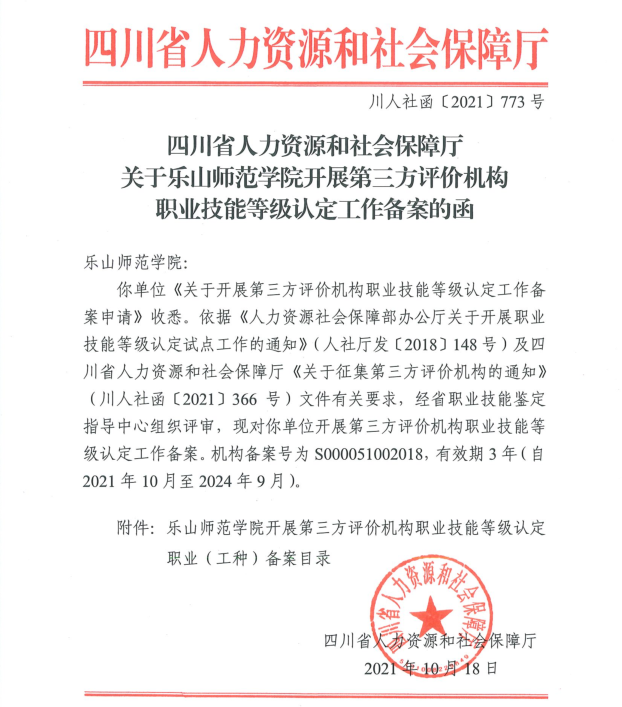 为响应国家职业资格制度改革,继续教育学院紧抓国家职业技能等级认定试点有利契机,根据四川省人力资源和社会保障厅《关于征集第三方评价机构的通知》(川人社函〔2021〕366号)文件有关要求,组织教学院向四川省人力资源和社会保障厅申报第三方评价机构。2021年6-7月,对申报职业(工种)、组织优势、专业优势、设施设备、专家考评员队伍以及技能等级认定的相关制度等支撑材料精心打磨并上报,经过省职业技能鉴定指导中心专家评审、材料整改等环节,历时近两月终申报成功。