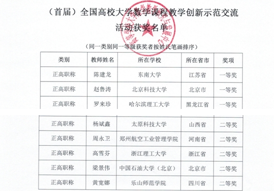 我校教师获(首届)全国高校大学数学课程教学创新示范二等奖