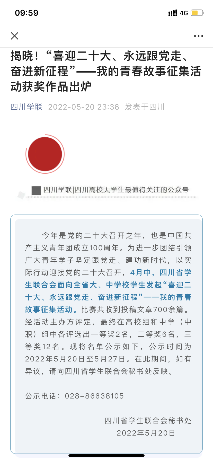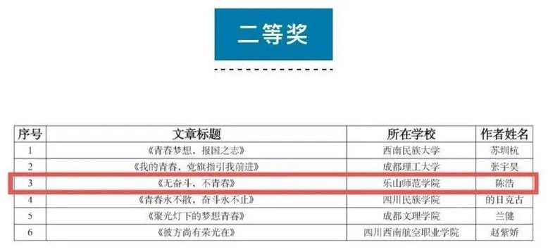 据悉,此次征文比赛由四川省学生联合会举办,面向全省各高校、中学(中职)在校学生。比赛历时半个月,共收到投稿700余篇,经大赛主办方评定及公示,在高校组、中学(中职)组各评选出12篇获奖征文。