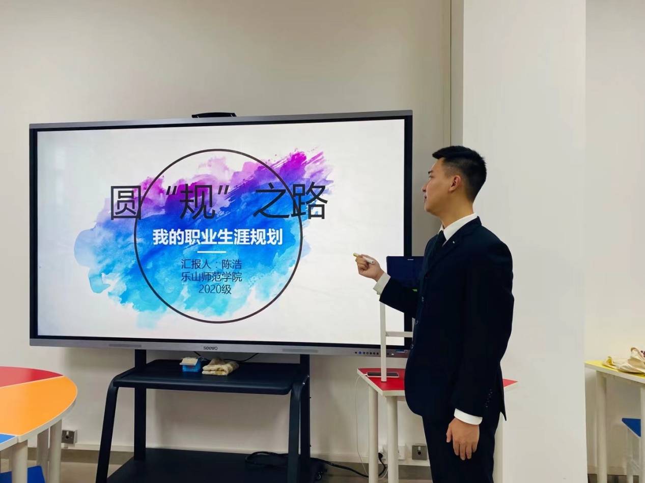 因疫情原因,决赛采用线上方式举行,并设有才艺展示、现场路演、评委提问答辩三个比赛环节。陈浩从自我评估、职业认知、目标定位、实施策略和评估调整五个维度向评委展示了自己的职业生涯规划目标和实施方案,规划明确、策略得当、逻辑清晰,体现出了良好的职业能力素养,展现了我校学生积极向上的精神风貌和投身环保事业的激昂热情,也展示了我校职业生涯规划教育的丰硕成果。