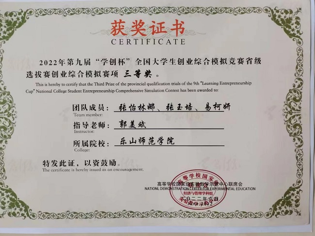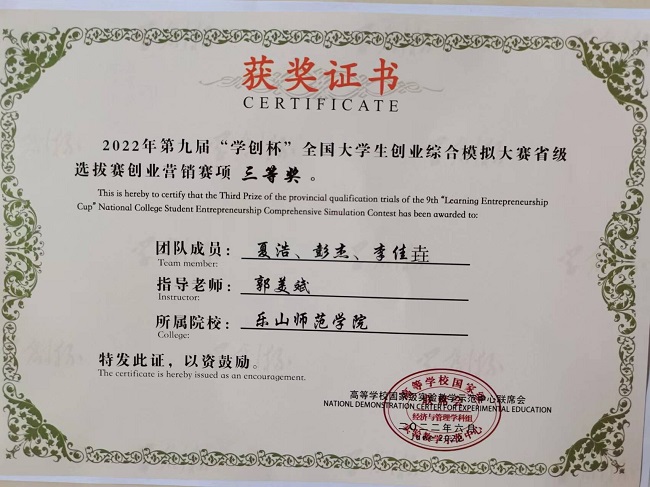 本网讯(文、图/张怡林娜)为提升乐山师范学院学生的创新创业能力,增强团队合作能力,让学生真正做到理论联系实践,在经济管理学院郭美斌教授的带领下,由市场营销专业、会计学专业和经济与金融专业的学生们组成的2支队伍参与了本年度的学创杯竞赛,两只队伍最终均取得了四川省三等奖的良好成绩,郭美斌教授获得了最佳指导老师的称号。