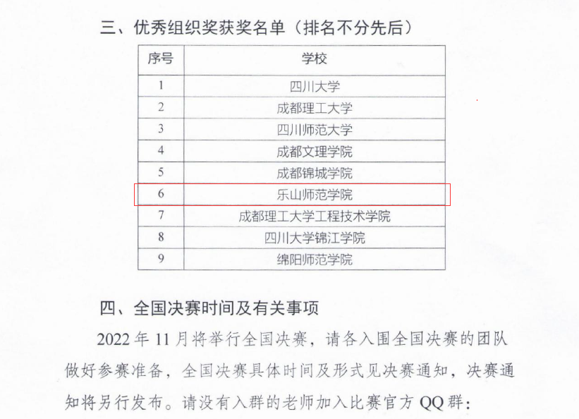 本网讯(文、图/郭亚西 徐波 )10月18日,四川省普通本科高校外国语言文学类专业教学指导委员会公布了2022 年四川省“高教社杯”普通本科高校外语课程思政教学比赛复赛英语专业组获奖名单,外国语学院参赛教师郭亚西及教学团队荣获特等奖,顺利晋级国赛。同时,乐山师范学院荣获优秀组织奖。