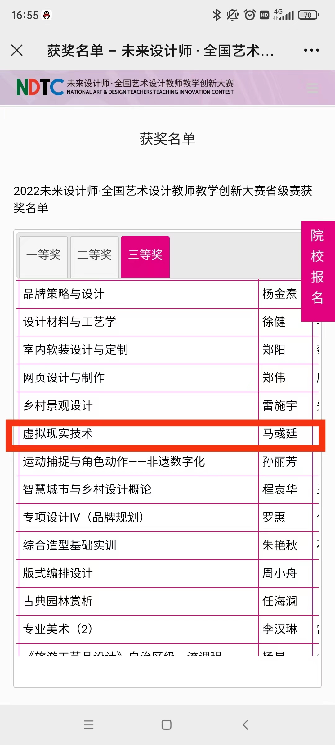 本网讯(文、图/马彧廷)经过紧张的评审、统计、汇总、公示等工作,2022未来设计师全国艺术设计教师教学创新大赛(教创赛)省级赛已全部结束。本届大赛共征集来自365所高校的740门参赛课程,参赛教师1727名,以省、自治区、直辖市为单位设立29个赛区。参赛作品经校赛推选,各省赛区分别决出一、二、三等奖。我校马彧廷老师荣获2022全国艺术设计教师教学创新大赛省赛三等奖