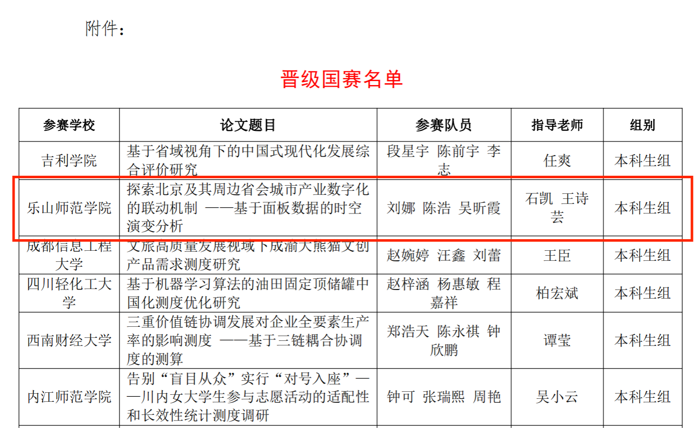 赛事首先经过组委会评审专家交叉匿名通讯评审方式,评选出25支团队进入省赛现场答辩环节,然后评定出22支队伍晋级国赛。数理学院在学院领导的大力支持下,由石凯、贾礼平、王诗芸等老师认真指导和组织答辩打磨,石凯、贾礼平老师带队现场答辩,2021级应用统计班刘娜、陈浩、吴昕霞同学组队,参赛作品为“探索北京及其周边省会城市产业数字化的联动机制—基于面板数据的时空演变分析”成功通过评选,晋级国赛,实现了我校在国家级统计类重要赛事项目上的突破。此外,数理学院刘高峰老师指导的学生团队还获得了1项省二等奖和2项省三等奖的优秀成绩。