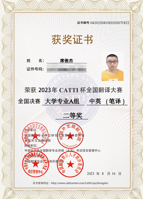 本网讯(文、图/王林)近日,第二届“CATTI杯”全国翻译大赛结果揭晓,外国语学院取得优异成绩。英语专业2020级席俊杰获得“CATTI杯”全国翻译大赛决赛(国赛)大学A组笔译二等奖;翻译专业2020级彭新然获得复赛(省赛)大学A组笔译三等奖;日语专业2019级陈颖、英语专业2020级朱子璇、翻译专业2020级张旦艳、周靓、张开珍等20人获得初赛大学A组(专业组)笔译一等奖、二等奖、三等奖和优秀奖。