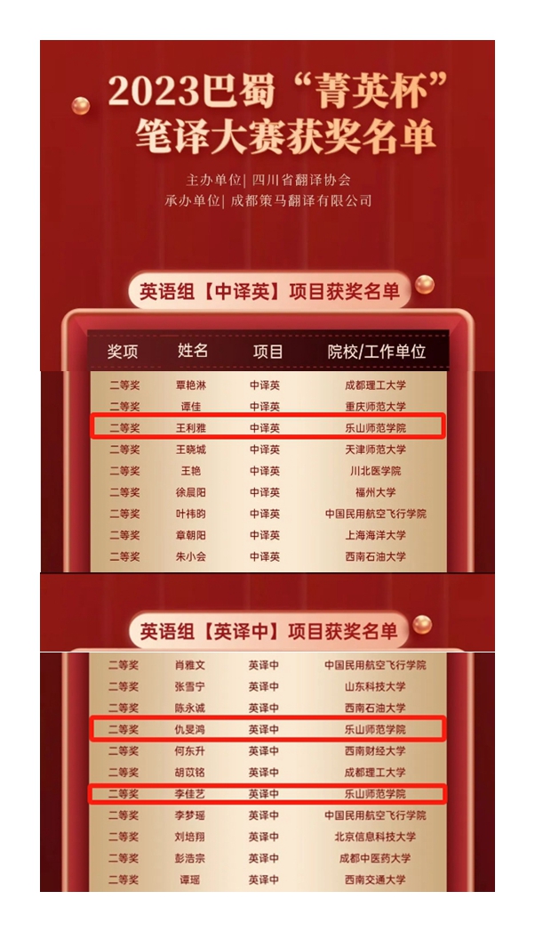 本网讯(文、图/王林)近日,第二届巴蜀“菁英杯”笔译大赛结果揭晓,我校外国语学院取得优异成绩。翻译专业2022级王利雅获得中译英组二等奖,翻译专业2022级仇旻鸿、李佳艺获得英译中组二等奖,翻译专业2020级陈佳慧、陈文玉和2021级胡何、谭宏雁获得英译中组三等奖,法语专业2020级杨明埔获得中译法组三等奖。还有多名同学获得优秀奖。此外,我校获得本次大赛优秀组织奖。