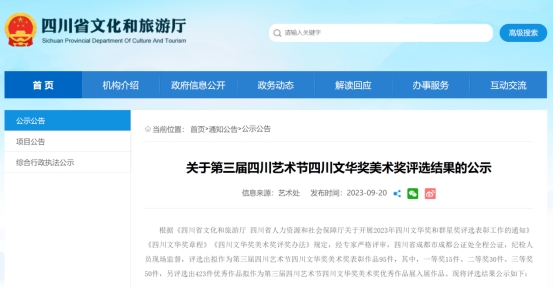四川省文化艺术政府奖——四川文华奖是经四川省人民政府批准设立,由四川省文化和旅游厅组织实施的省级文化艺术政府奖。四川文华奖是四川艺术节的一项重要内容,每四年评选一届,在每届四川艺术节期间举行。四川文华奖评选坚持以习近平新时代中国特色社会主义思想为指导,坚持 “二为”方向、“双百”方针,坚持创造性转化、创新性发展,尊重艺术规律,遵循公平、公正、公开原则,突出导向性、专业性、权威性。