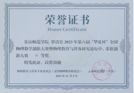 本网讯(文、图/许德富)第八届全国“华夏杯”物理教学创新大赛2023年11月3日在云南师范大学开幕,来自华东师范大学、东北师范大学、华中师范大学、西南大学等全国100所师范院校的500多名物理学专业本科生、研究生参加该项赛事,经过两天的紧张比赛,11月5日落下帷幕。我校数理学院物理学专业4名同学参加该项赛事,杨月同学展示的《探究平抛运动的规律》获本科生组一等奖,罗清同学展示的《大气压强的存在》荣获本科生组二等奖,李玉欢同学展示的《静摩擦力的大小》荣获本科生组三等奖,刘哲媛同学展示的《探究超重和失重的条件》荣获本科生组三等奖。