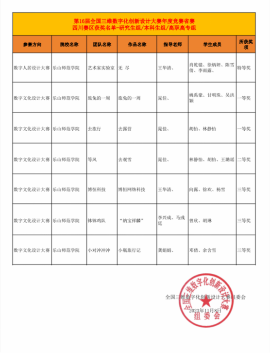 本次大赛我校参赛团队们在指导老师指导陪伴下,面对比赛压力,沉着冷静,用行动诠释了奋力拼搏、勇往直前的乐师精神。此次,我校在第16届全国三维数字创新设计大赛四川赛区取得优异成绩,离不开乐山师范学院领导、教学部、分院领导的关心和大力支持,未来我院师生将继续努力,再创佳绩!